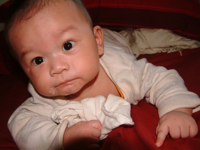 好不容易又挖出了些蘋果泥,再餵了你一口,你又手足舞蹈了起來。哈哈~