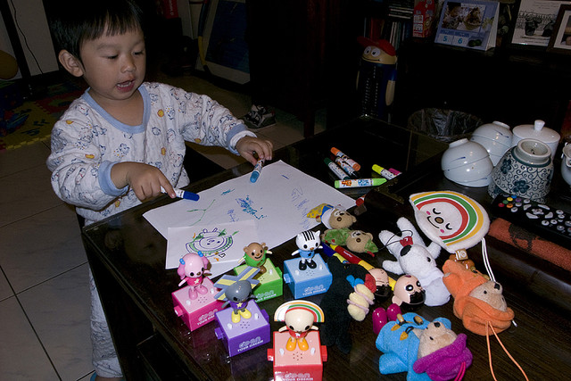 滿桌都是玩具,你想要怎麼畫都沒關係。牆壁不要畫就好了!