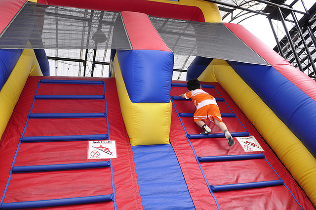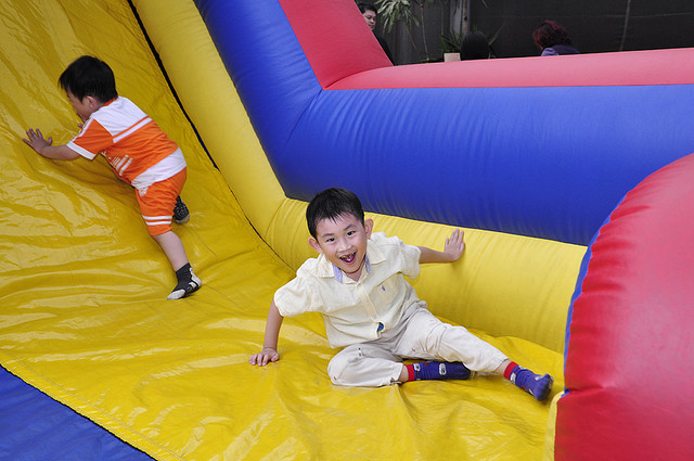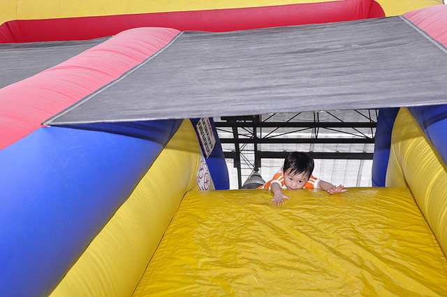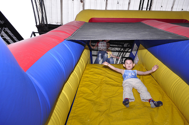 非常高的溜滑梯不見了,因為怕下雨只在室內搭起一個小小的。