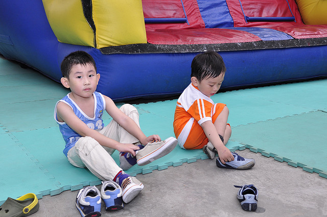 回家盥洗後你們兩都沒氣力了,玩得太累!爬上、滑下,碰碰跳跳的。
