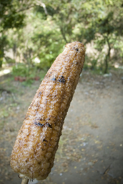 途中經過烤玉米店,很多人。當然要試看看好不好吃。