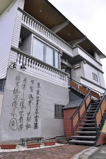 民宿內的花花草草,壁面上也不知題了什麼字?