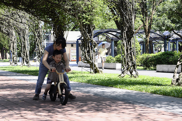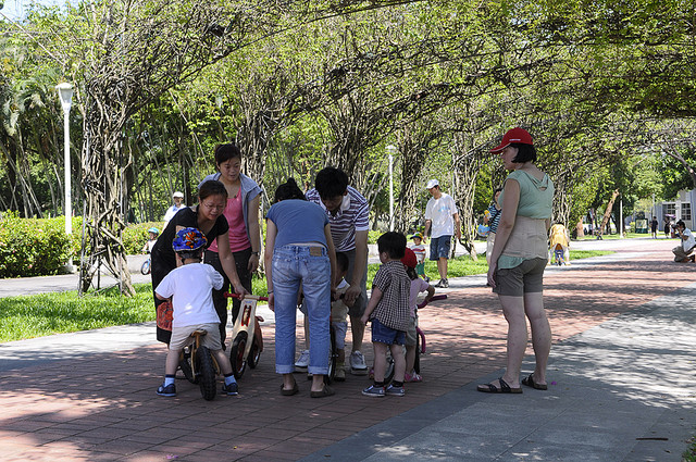 小朋友是大人之間很好溝通的橋樑喔~整群媽媽圍在一起,互換腳踏車。