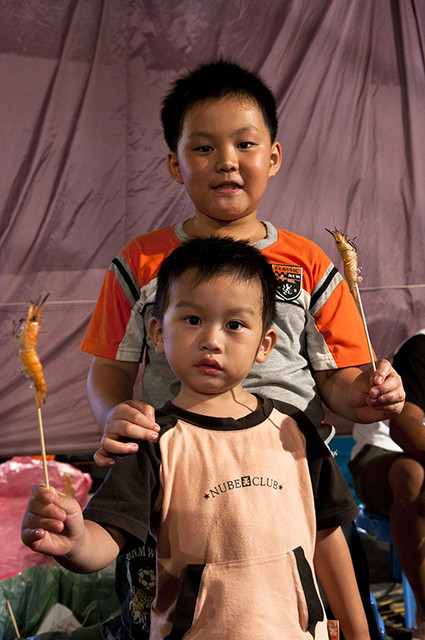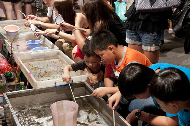 我們一群人在夜市外圍繞來繞去,好像怎麼也擠不進賣吃的攤位。只好釣蝦子來吃吃~