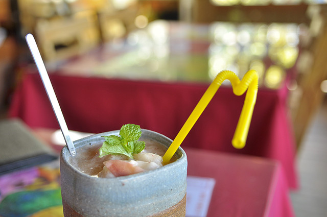 內部是木造的房子,四周擺設很多陶藝品。怕你亂摸,選了個正中間的位置,上飲料吧~