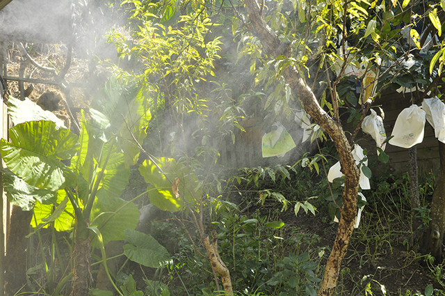 光影超美的,陽光從樹中透出再混合著灑水裝置的水霧。