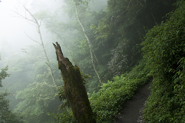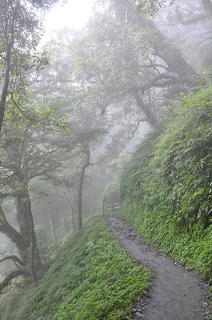 回頭路,霧茫茫。旁邊就是山谷,很可怕。