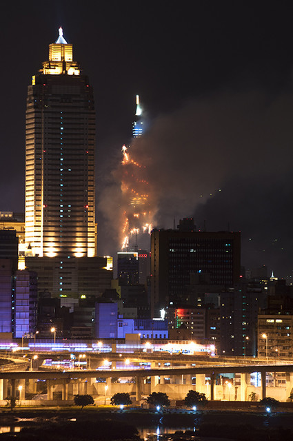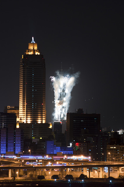 我把腳架、快門線都就定位。近十二點時,左方的大佳河濱上空,開花了~