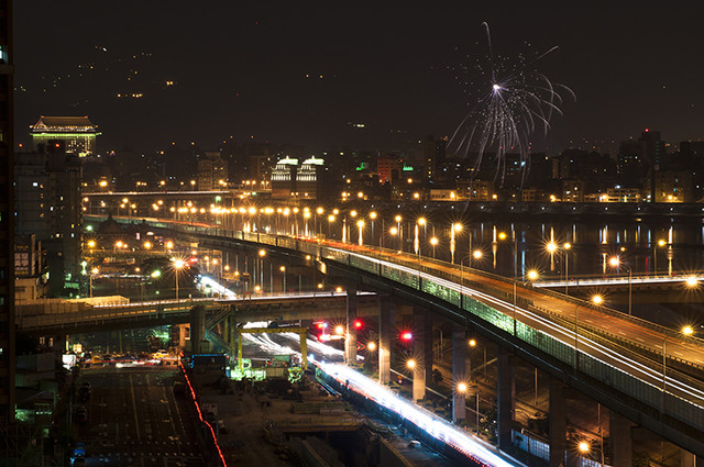 天空被煙火整個塞滿,遠方城市燈火、中間路燈再加上車流線條。整個超美~