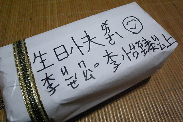 心意到了就好了,禮物還特別的包裝呢~後頭還寫上祝福的話,雖然有錯字。哈哈~
