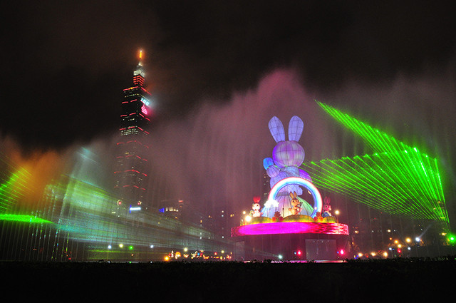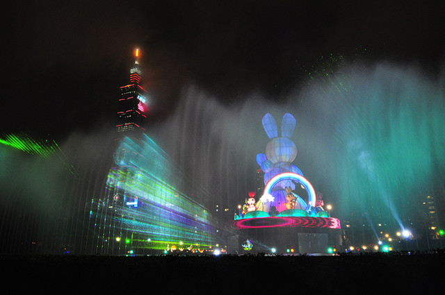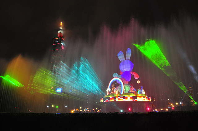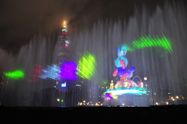 熄燈~兔子動了、發亮了,燈光四起、水舞搖曳、音樂節奏隨著雨勢漸漸變大⋯⋯