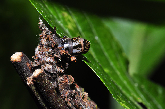 噁~叔叔發現的毛毛蟲,從像是小樹隻的蛹內爬出。