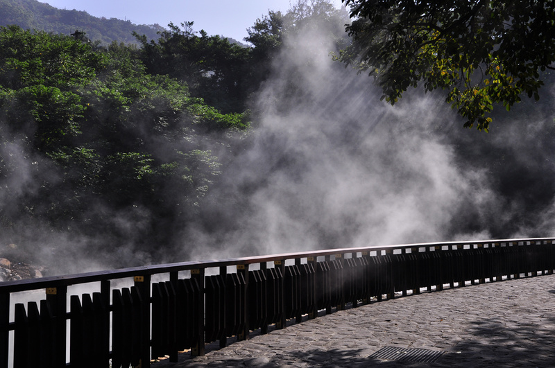 原因是日出晨光照射在溫泉冒起的蒸氣,幻化出變化多端的光影,如身處如夢似幻的仙境當中。