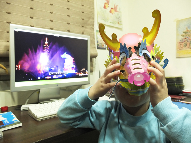 我把花燈錄下來,放到電腦上讓你看。你頭戴著龍型頭飾直誇螢幕上花燈好漂亮~