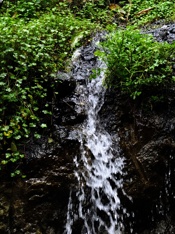 從山坡上竄出的小瀑布,水珠在小葉子上跳舞。