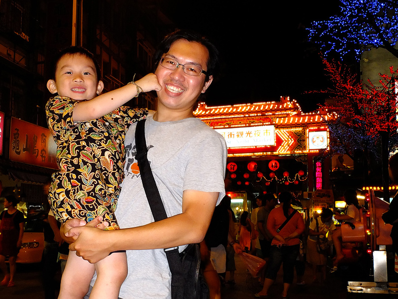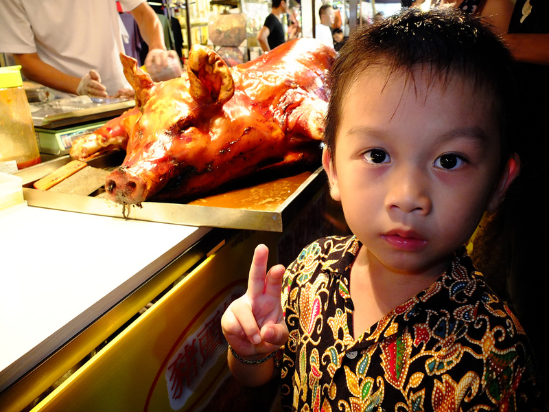 突然你拉著我的手往攤販邊擠,懋:爸~我發現一隻豬,我要跟它拍。