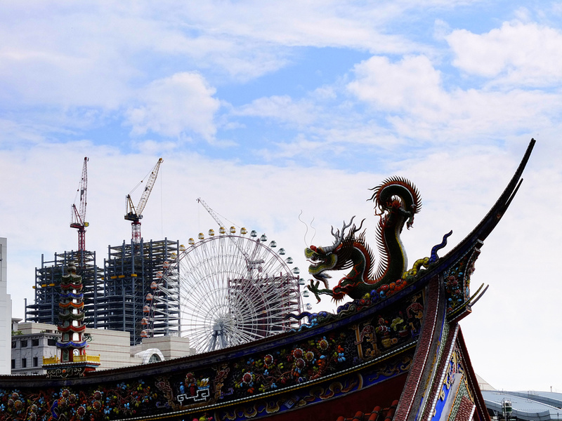 換個方向看,也沒多多差。古寺的龍與摩天輪在爭地盤而已。