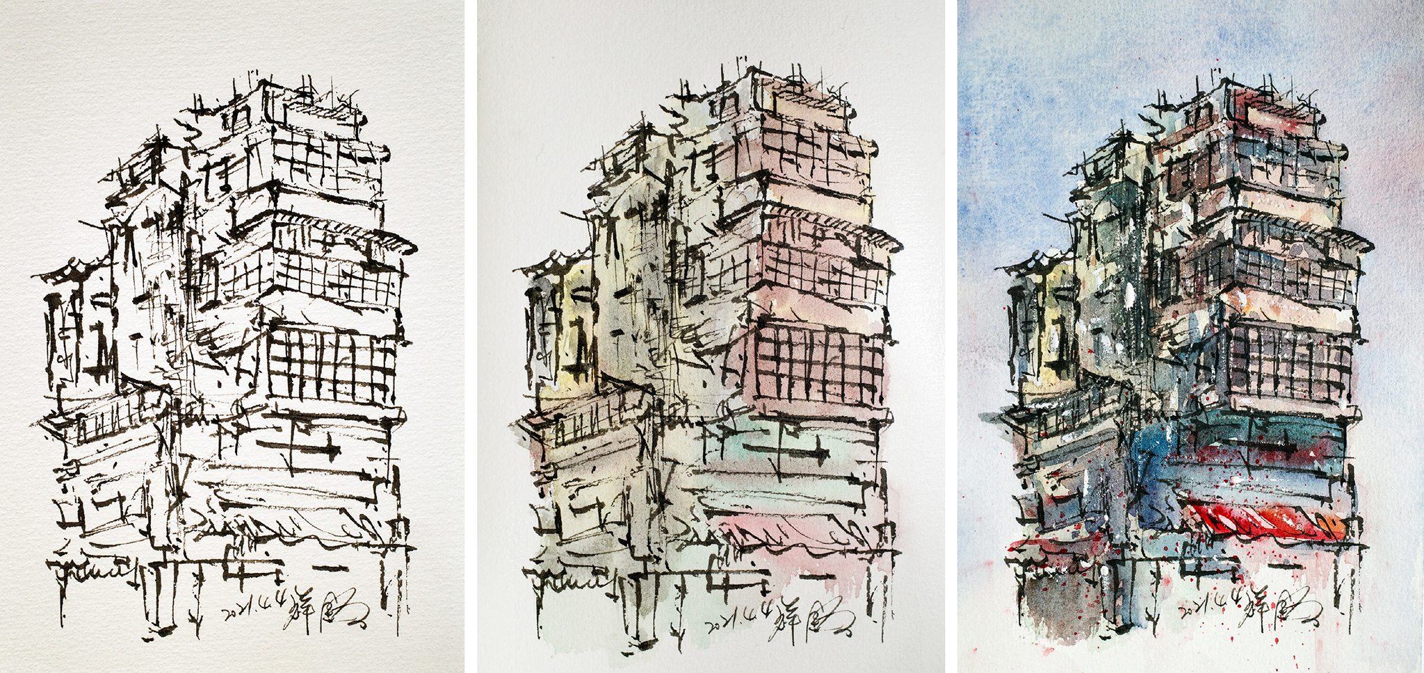 屋頂瓦片波浪從左至右,我刻意壓低鋼筆讓它從粗變細,再轉個角度。