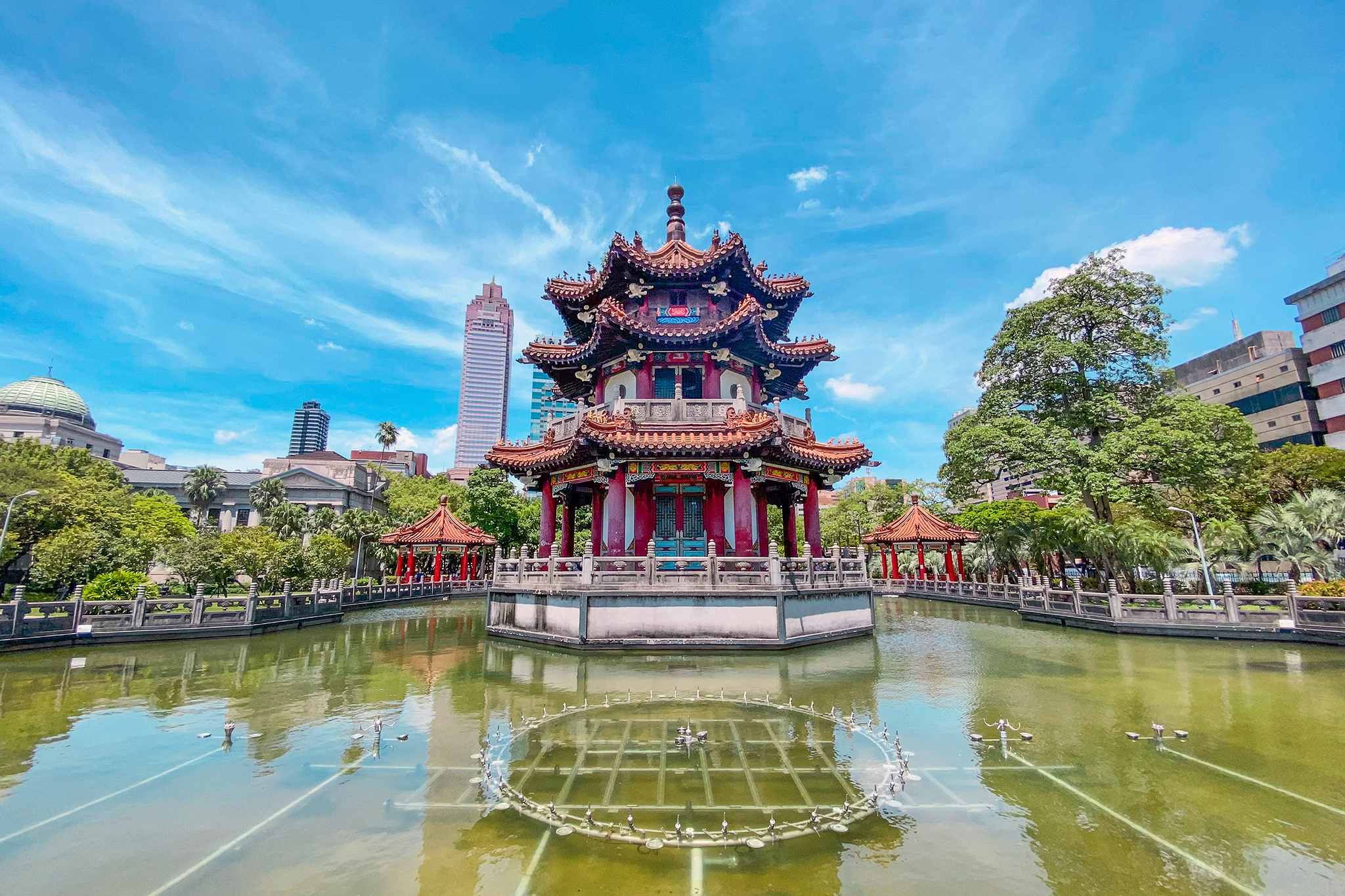 我走到石橋的對岸水池邊揮手,你注意到我了。